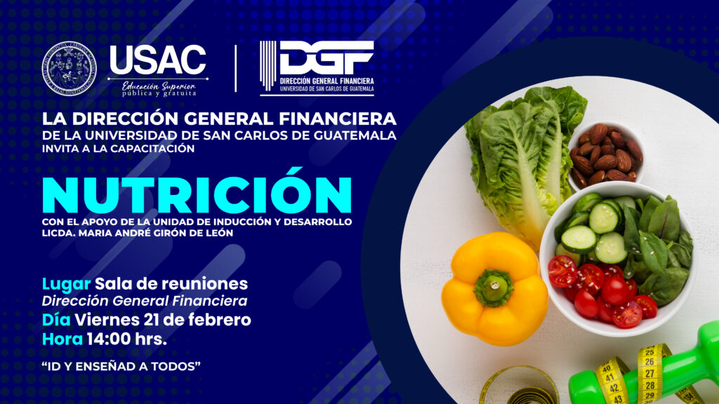 2025 Actividades Capacitación «Nutrición» por admin|Publicada 21 febrero, 2025 Dirigida al personal de la Dirección General Financiera de la Universidad de San Carlos de Guatemala.